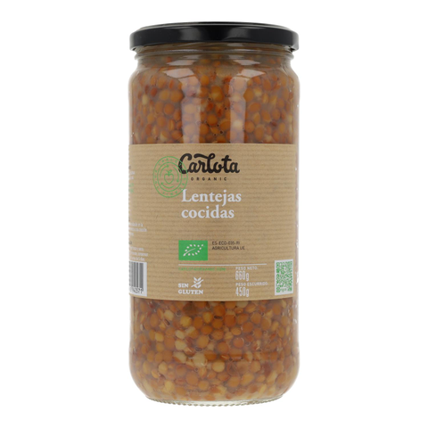 Lentejas cocidas. Bajo en grasas y sin gluten. De origen ecológico. Las legumbres Carlota Organic son seleccionadas cuidadosamente y conservan todo su sabor y textura naturales. Conservar en lugar fresco y seco. Una vez abierto el envase, conservar en frío y consumir antes de 3 días.
