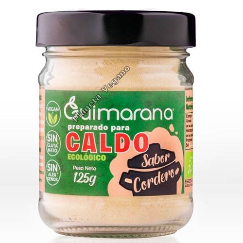 Preparado vegano y ecológico para caldo sabor cordero. Proporciona todo el sabor a tus recetas con este preparado para caldo, sin gluten, sin glutamato, sin alérgenos y totalmente vegetal. Ahora puedes realizar todas esas recetas tradicionales que tanto te gustan sin renunciar al sabor de el cordero. Lo puedes preparar para un asado con seitan, una caldereta incluso para un gazpacho manchego. Úsalo para hidratar, cocer o realzar el sabor de cualquier receta vegana sin perder tiempo en su preparación. Aumenta la creatividad en tu cocina con este preparado ecológico para caldo vegano sabor cordero. Úsalo a diario en tus recetas veganas y tradicionales porque no contiene aditivos como el glutamato. Todos nuestros ingredientes están seleccionados y tienen la más alta calidad. Con productores y proveedores locales para fomentar la economía de proximidad. Ingredientes: Sal, almidón de maíz*, dextrosa*, extracto de levadura*, especias* y aroma natural. *Ingredientes procedentes de la agricultura ecológica.